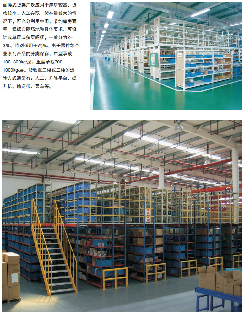 昆山閣樓貨架,昆山閣樓式貨架,昆山閣樓式多層貨架 閣樓式貨架系統(tǒng)是在已有的工作場地或貨架上建一個中間閣樓,以增加存儲空間,可做二、三層閣樓,宜存取一些輕泡及中小件貨物,適于多品種大批量或多品種小批量貨物,人工存取貨物.貨物通常由叉車、液壓升降臺或貨梯送至二樓、三樓,再由輕型小車或液壓托盤車送至某一位置。 近幾年多使用冷軋型鋼樓板,它具有承載能力強、整體性好、承載均勻性好、精度高、表面平整、易鎖定等優(yōu)勢.有多種類型可選,并且易匹配照明系統(tǒng),存取、管理均較為方便。單元貨架每層載重量通常在500kg以內(nèi),樓層間距通常為2.2m~2.7m,頂層貨架高度一般為2m左右,充分考慮工作人員操作的便利性。 樓層設(shè)計根據(jù)各種安裝情況定制,可在現(xiàn)場輕松裝配,無需焊接。閣樓貨架系統(tǒng)在汽車零部件領(lǐng)域、汽車4S店、輕工、電子等行業(yè)有較多應(yīng)用。