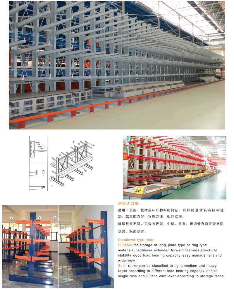 1、懸臂貨架系列全部采用組合式,拆裝,運(yùn)輸,調(diào)節(jié),移動(dòng)等簡易方便,安全可靠