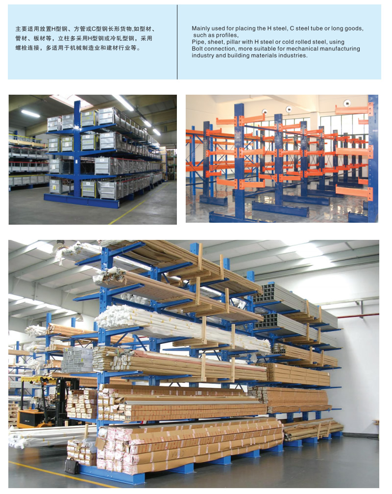 懸臂式貨架多用于機(jī)械制造行業(yè)和建材超市等。加了擱板后,特別適合空間小,高度低的庫房,管理方便,視野寬闊,利用率比普通貨架更高。懸臂式貨架是在傳統(tǒng)式貨架支柱上裝設(shè)外懸臂而成,是一種長形物專用的貨架。