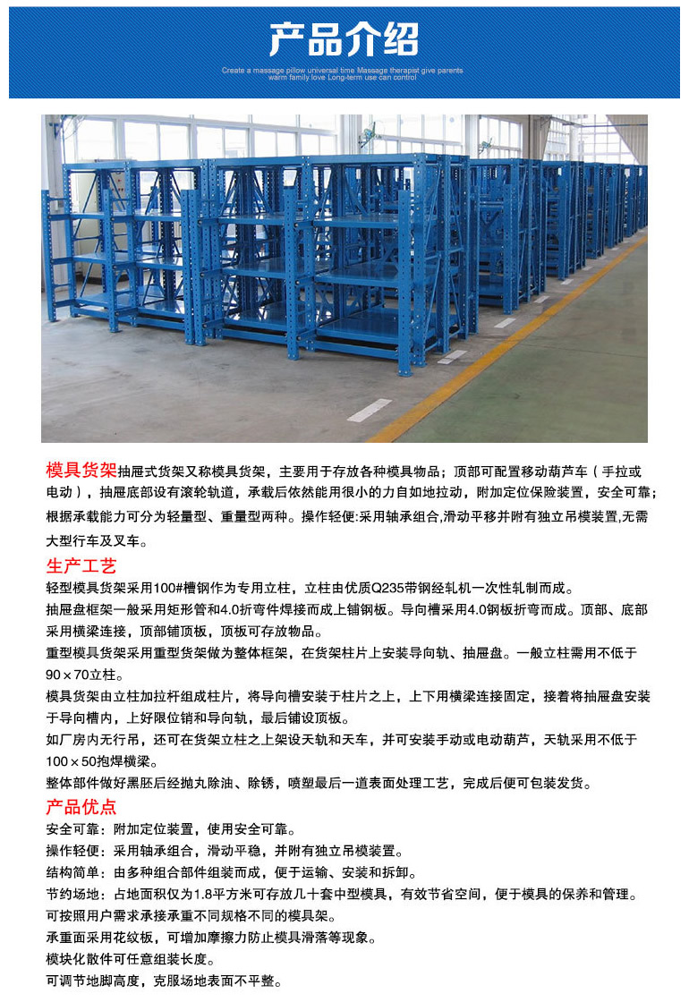 昆山模具架定做的制作工藝流程是什么?在選購模具貨架之前,簡單了解它的制作工藝流程以及它的特點是很有必要的。了解模具貨架制作流程可以讓我們在選購模具貨架的時候知道怎么考量它的質(zhì)量好壞,而模具貨架的特點是決定是否正確選擇的關(guān)鍵,一般情況之下,在選購之前,咨詢本公司的專業(yè)人士是非常有必要的,我們首先需要保證的是自己選擇的是一家專業(yè)的模具貨架制造公司。