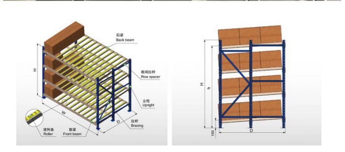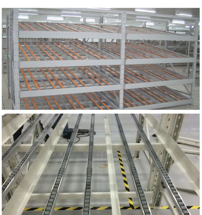 1、采用滾輪式鋁合金等流力條,利用貨物自重實現(xiàn)貨的先進先出。