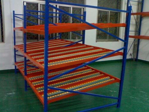 ◇ 太倉(cāng)滑移式貨架簡(jiǎn)稱流利架,是將貨物置于滾輪上,利用一邊通道存貨,另一邊通道取 貨。